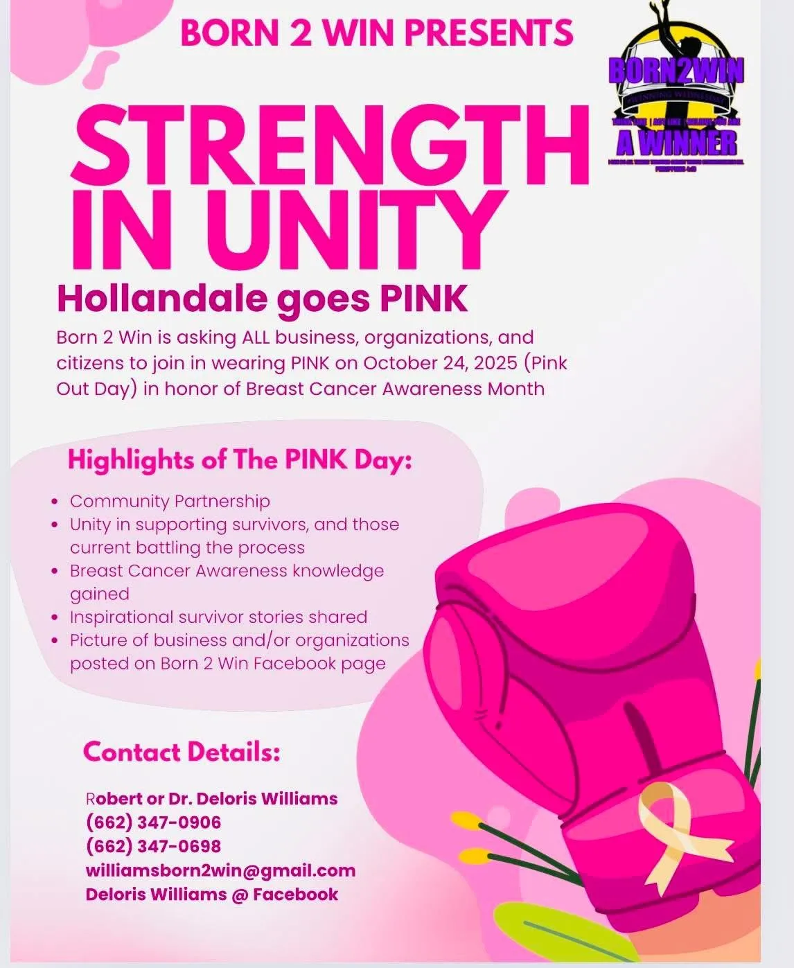 Join Born to WIN as we paint our community PINK💗💗💗 in honor of Breast Cancer Awareness Month. Please share and encourage others to take part in Hollandale Pink Day💗💗